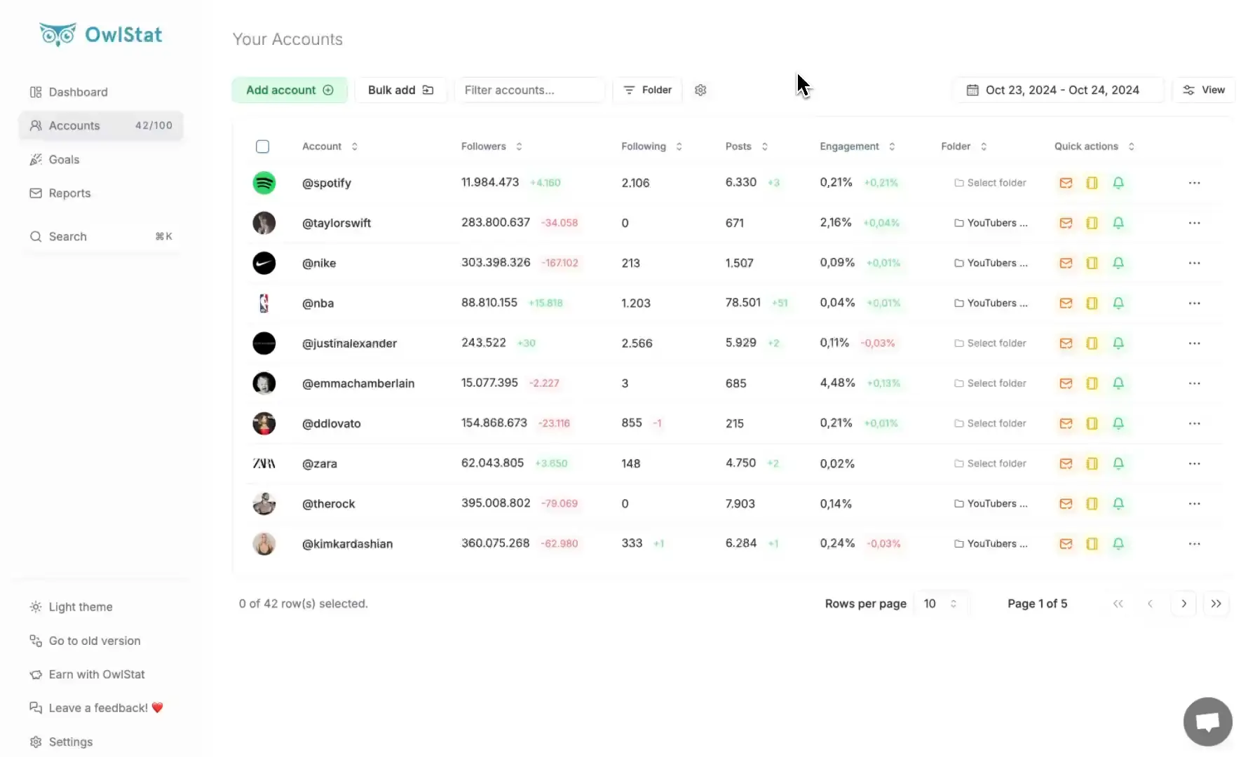 Daily follower count with clear trends. Spot spikes, plateaus and drops before they compound.